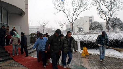 漫天的雪花肆意地下着,伴着冷冽的寒风在空中飘舞。连日来的雨雪天气给寒冬的校园增添了一道美丽的风景,但是也给学校的安全带来了很大的隐患。学校综合楼前、河东的文武桥、河南的两座桥上都积满了厚厚的积雪,由于天寒地冻,桥上还结了一层薄冰,显得更加的湿滑,很容易造成同学和老师行走时不慎滑倒摔伤,导致人身安全事故的发生。后勤服务公司从总经理陈勤源、总支书记杨生龙、副书记孙积耀、副总经理王磊、物业中心的主任、副主任等领导与物业的安保、大楼部、维修部等员工们一同参与到了清除积雪、积冰的紧急任务中来。