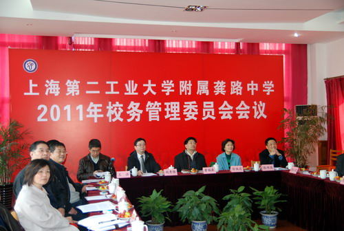 3月10日下午,我校附属龚路中学2011年校务管理委员会会议在龚路中学召开,浦东新区教育局局长曹锡康、副局长王浩、基础教育处处长赵连根、曹路镇党委书记张伟国等新区领导和我校党委书记徐佩莉、校长胡寿根、副校长王刚等共同出席,会议由王浩主持。
