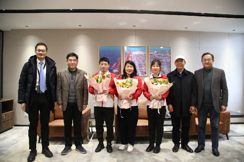 座谈会前,上港集团副总裁方怀瑾、丁力副校长和上海市人社局市职业技能鉴定中心主任孙兴旺共同接见了2022年世界技能大赛特别赛货运代理项目参赛金牌团队中国专家吕秀文女士、金牌获奖选手朱珂和赛场翻译杨俊鹏先生。