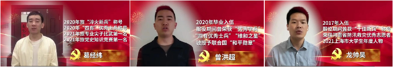 已经毕业的退伍优秀士兵代表葛经纬、曾洪超、龙帅昊通过视频的形式为即将步入军营的学弟学妹们送上了祝福。