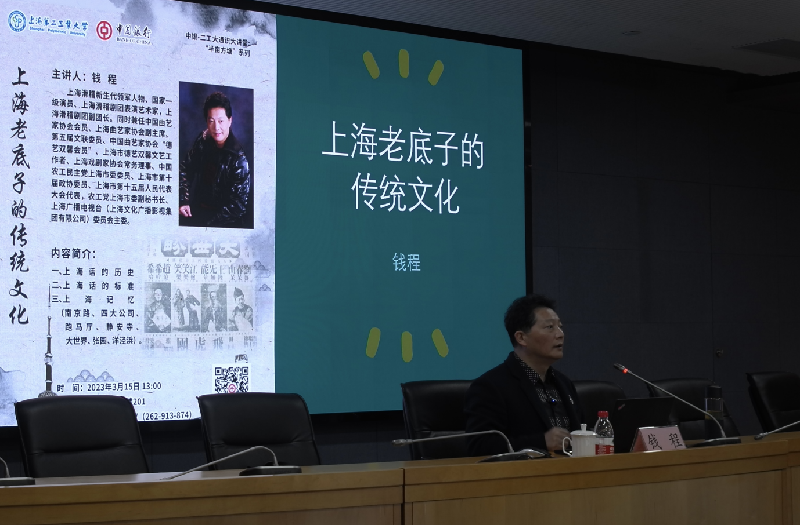 钱程是上海滑稽新生代领军人物、国家一级演员、表演艺术家,上海滑稽剧团副团长,第五批国家级非物质文化遗产代表性项目代表性传承人。讲座中钱程从“上海话的历史”、“上海话的标准”以及“上海记忆”三个方面介绍了上海传统文化。