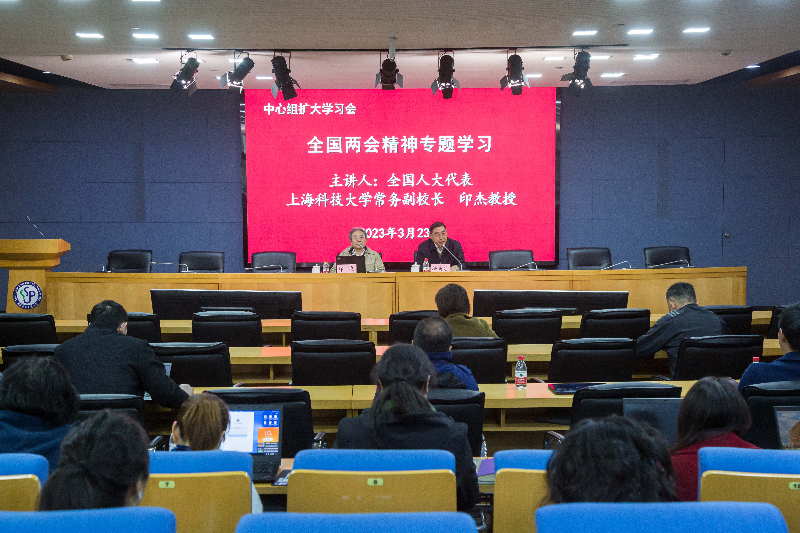 3月23日上午,学校举行党委理论学习中心组扩大学习会,特邀全国人大代表、上海科技大学常务副校长印杰教授作专题辅导报告,传达学习全国两会精神。校领导,校党委委员,中层干部,系主任,学科带头人等参加学习会。学习会由副校长徐余法主持。