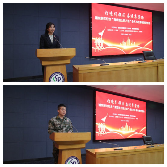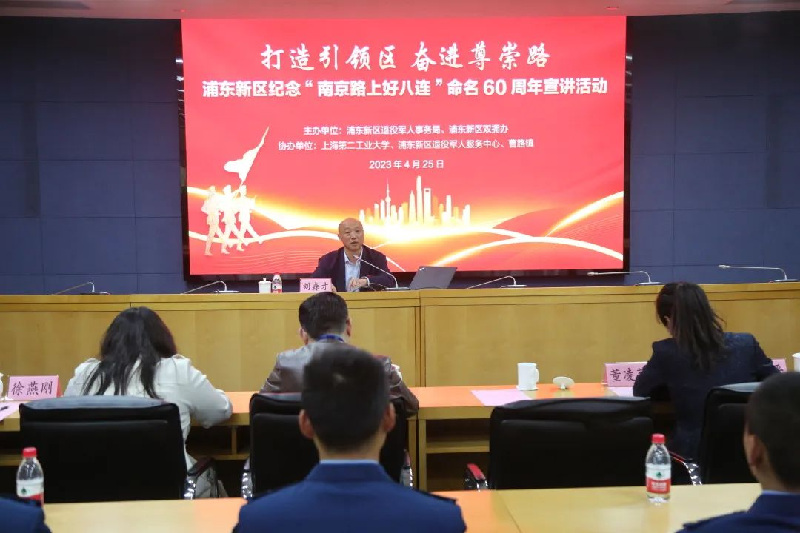 4月25日下午,由浦东新区退役军人事务局、浦东新区双拥办主办,上海第二工业大学、浦东新区退役军人服务中心、曹路镇协办的“打造引领区 奋进尊崇路”——浦东新区纪念“南京路上好八连”命名60周年宣讲活动在我校举行。区双拥办副主任、区退役军人事务局拥军褒扬处处长李杰,校党委学(研)工部部长、武装部部长、学生处处长董凌莉、曹路镇副镇长徐扬、区退役军人服务中心副主任瞿洁平、海军某部政治部主任徐燕刚、空军某部指导员邓国鑫出席会议。活动邀请原“南京路上好八连”副指导员刘森才为主讲嘉宾,讲述“好八连”服务社会、奉献爱心、全心全意为人民的精神。活动由校武装部副部长陈钦主持。