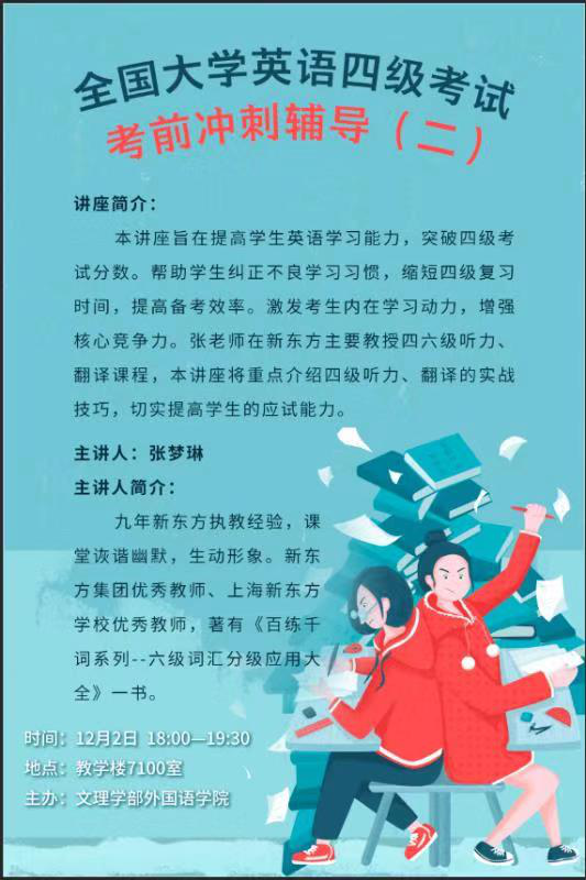 本讲座旨在提高学生英语学习能力,突破四级考试分数。帮助学生纠正不良学习习惯,缩短四级复习时间,提高备考效率。激发考生内在学习动力,增强竞争力。张老师在新东方主要教授四六级听力、翻译课程,本讲座将重点介绍四级听力、翻译的实战技巧,切实提高学生能力。