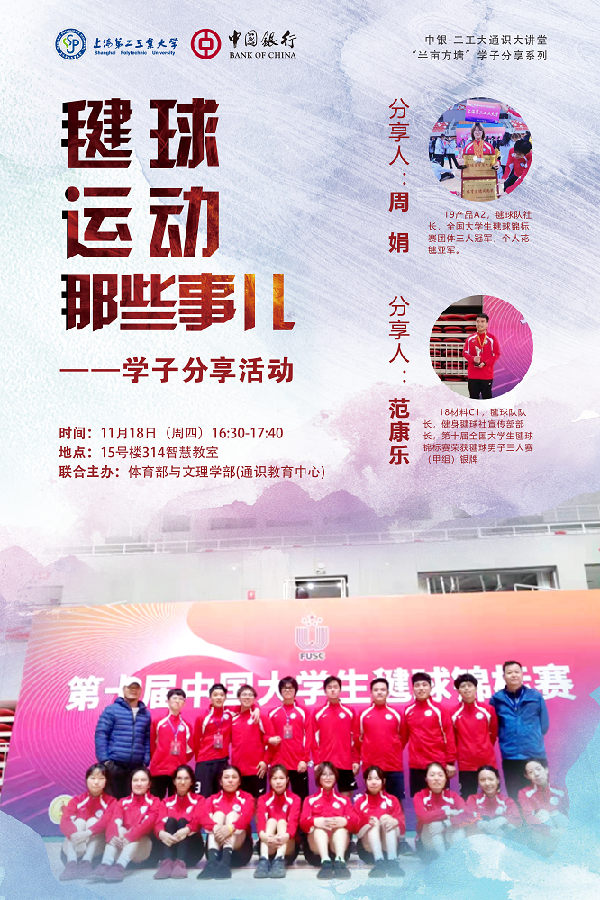 活动简介:我校毽球队由体育部孙玮老师任领队、张伟老师任教练,勇夺2021年中国大学生毽球锦标赛冠军。通识教育中心邀请了参与本次大赛的两名同学来分享经验和大赛感受,并通过现场展示环节,帮助大家掌握毽球运动的技巧,顺利通过校本项目测试(连续踢40个或1分钟踢到60个毽子)。欢迎大家参加此次分享活动。